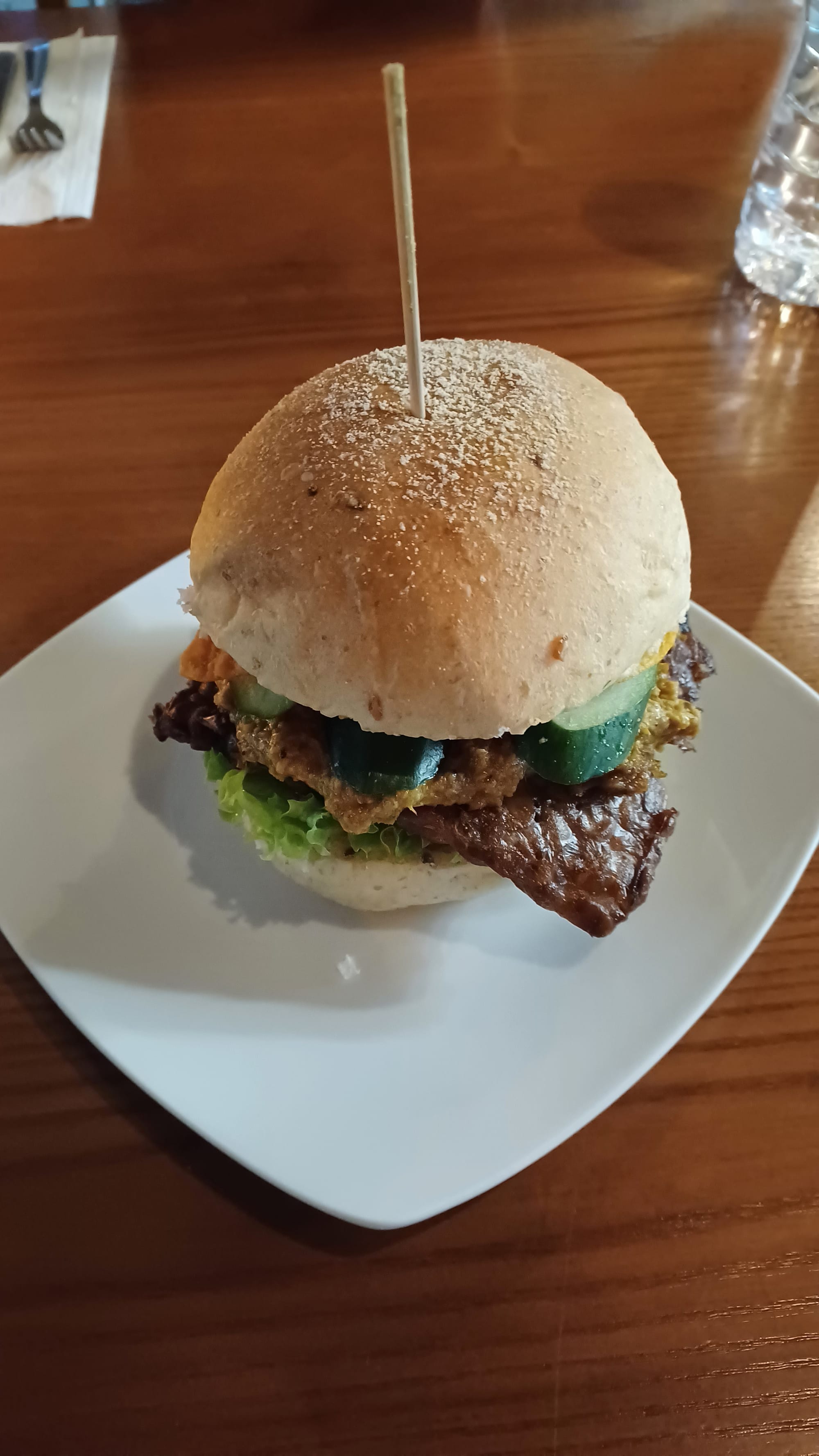A vegan fast food place, where I tried the tempeh rendang burger - a twist on a traditional dish.
