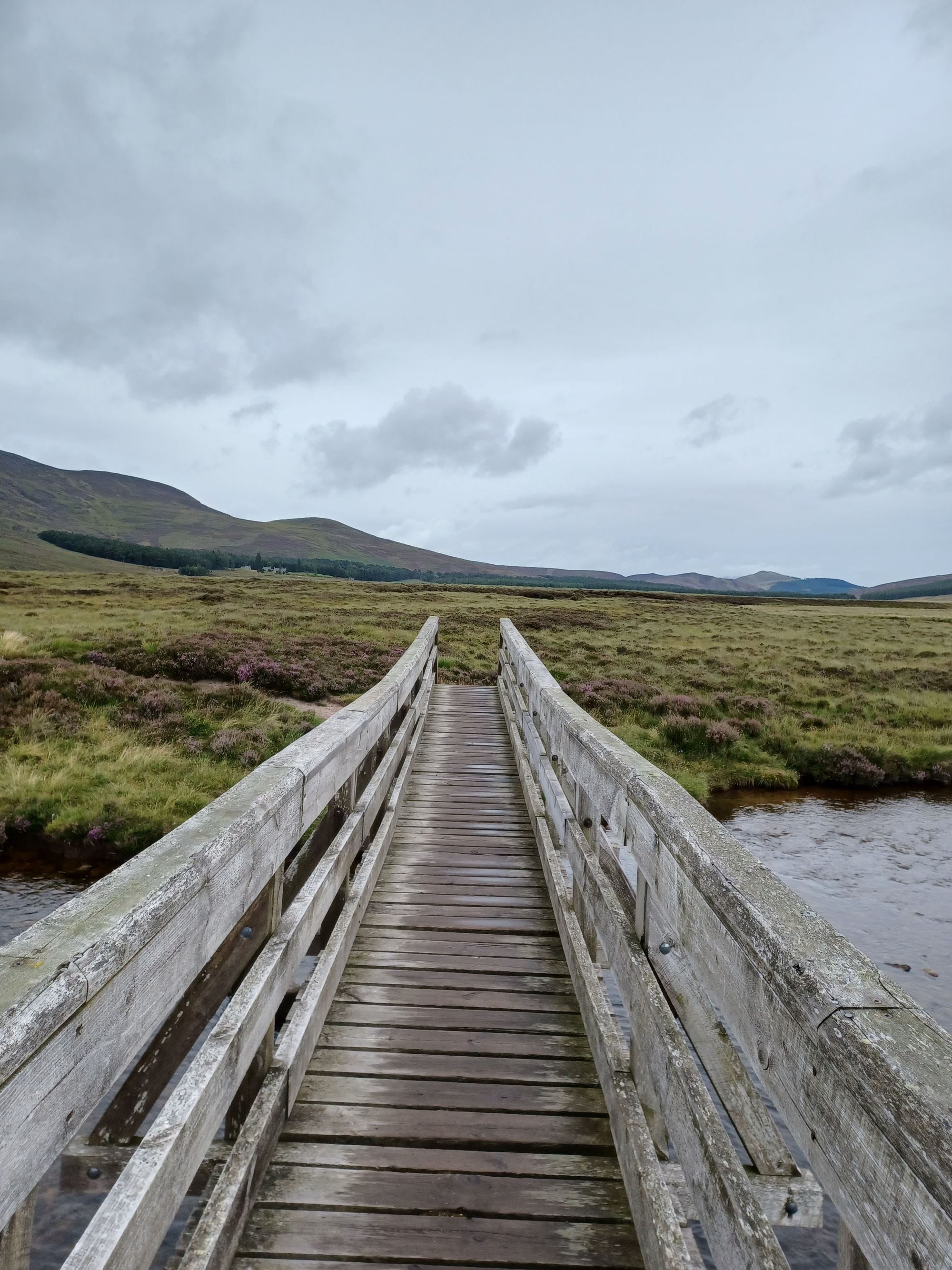 There's a large car park at Glen Muick, which is where we parked. Note that there is a charge for the carpark, and there's also access to public toilets and a visitor centre to purchase snacks, maps and get some advice. This is where the walk starts, and it takes you along the flat terrain of Glen Muick, crossing a bridge over the River Muick.