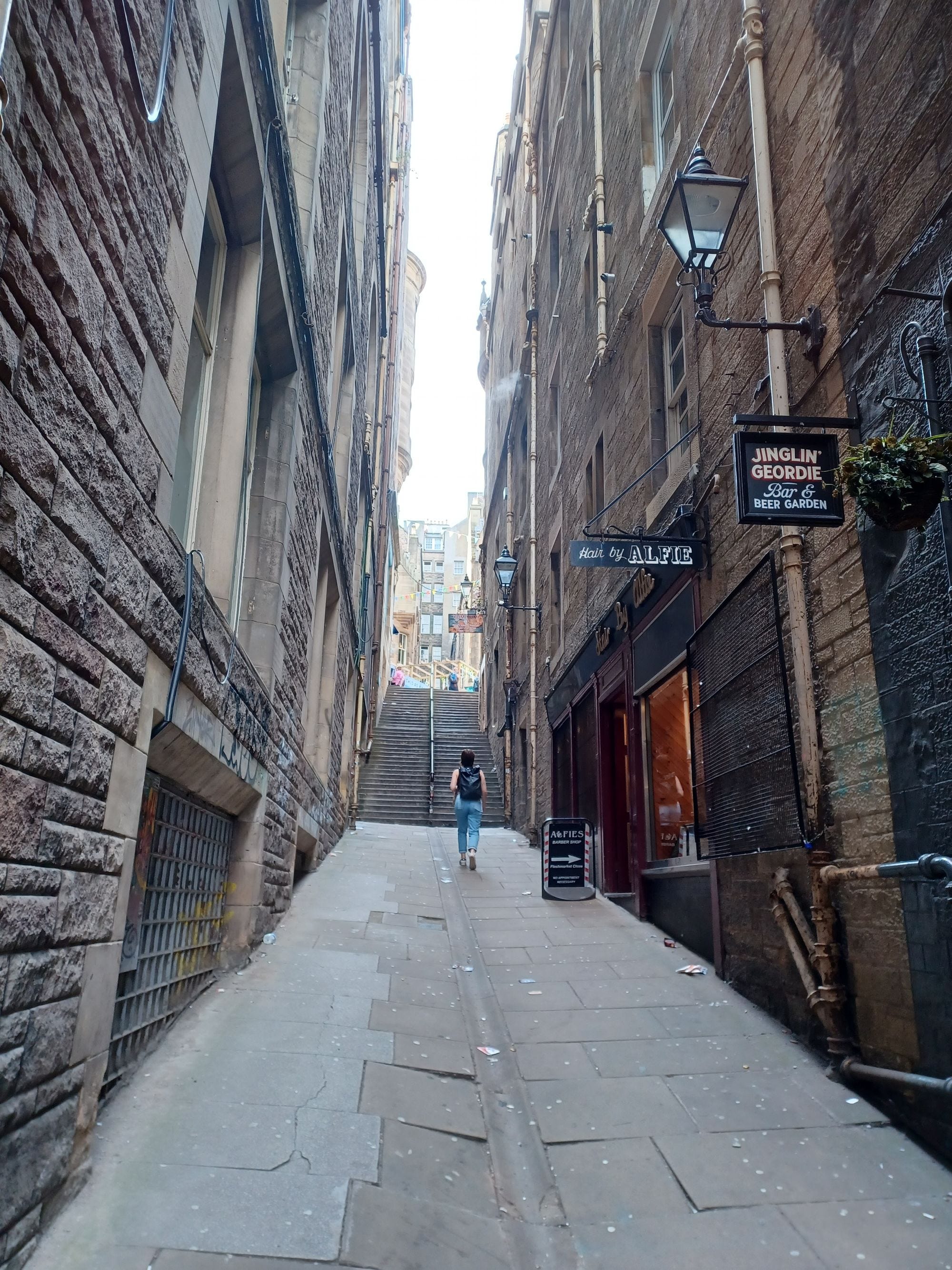 Edinburgh Station itself was nicely done, in particular one of the waiting rooms which had a historical design with a glass arch to let the sunny weather in. There were plenty of places to grab a drink and a bite to eat if needed. After exiting onto street level, we headed up an alleyway which would lead us to the Royal Mile. These narrow stairways would frequently show up as we walked around Edinburgh during the day, almost giving it a maze-like feel at times.