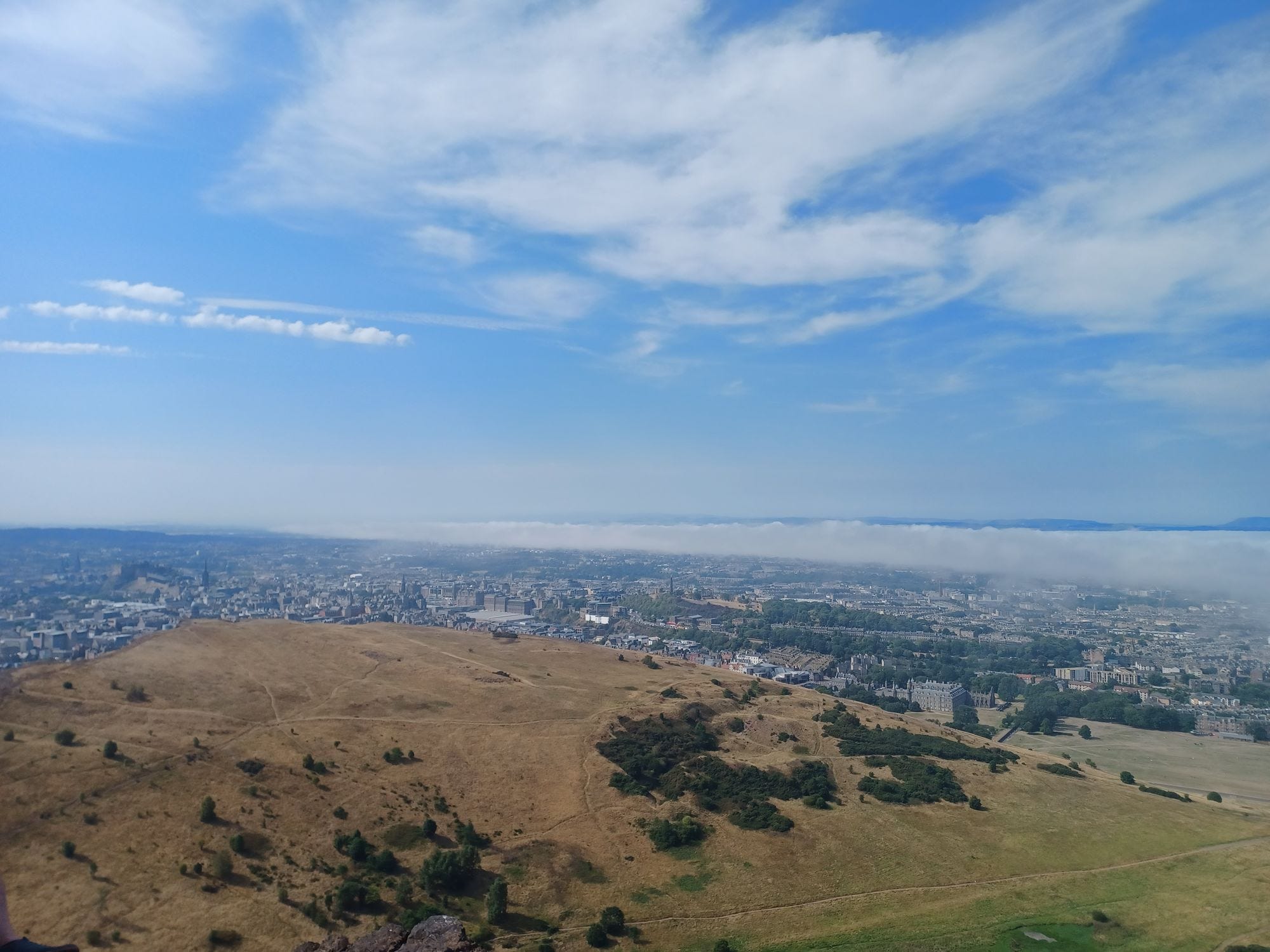 After the show, which was thoroughly entertaining, I decided to head off and climb Arthur's Seat, located in Holyrood Park, a 640 acre Royal Park adjacent to the Palace. Within the park lies it's highest point, Arthur's Seat, an ancient volcano that sits 251m above sea level. The weather was pretty warm and sunny, and I just had regular trainers on which made some bits of the ascent a bit slippery! But on the whole it is a pleasant and comfortable hike to the top, with amazing views across the city. When I got to the top, a fog was blowing in from the coast, which covered half the city in this blanket of clouds, which was quite a view. The fog then got a bit too close for my liking and started covering the path down so I decided to make a move then.